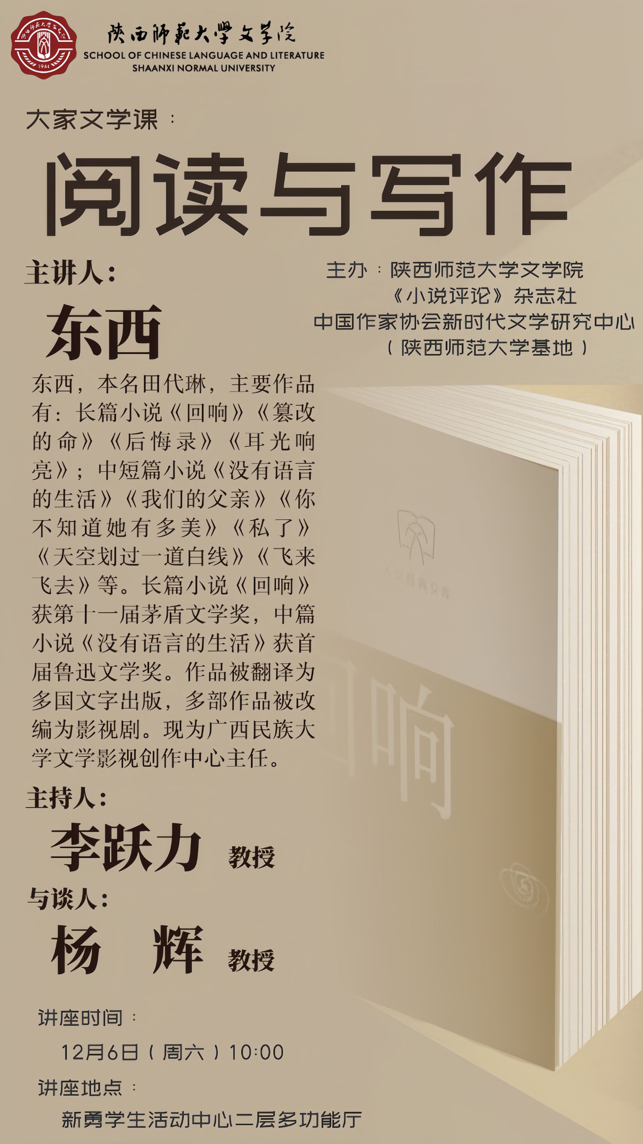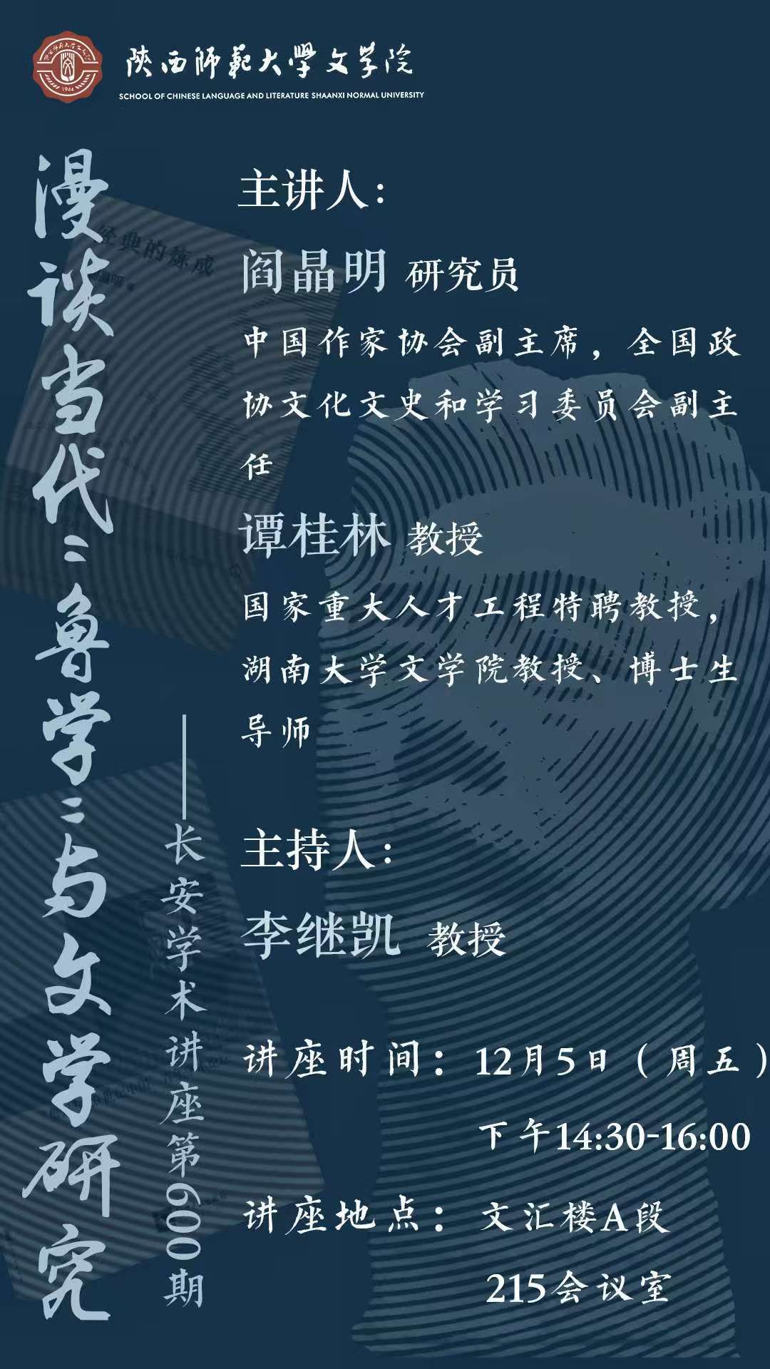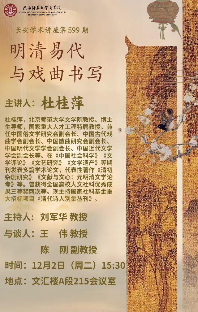 (通讯员:李雨濛)12月2日下午,由我院主办的长安学术讲座第599期在文汇楼A段215会议室举行。北京师范大学文学院教授、博士生导师、中国古代戏曲学会副会长、中国散曲研究会副会长、中国明代文学学会副会长杜桂萍应邀主讲“明清易代与戏曲书写”。本次讲座由我院刘军华教授主持,王伟教授、陈刚副教授与谈,文学院师海军教授、刘彦青副教授、陈丽娟老师及相关专业研究生参加了讲座。杜桂萍教授以明清易代之际的戏曲书写为研究对象,...