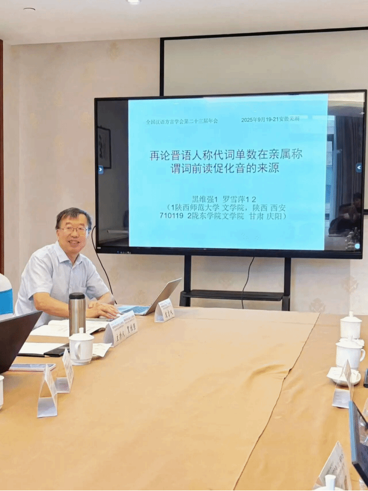 黑维强教授的报告题为《再论晋语人称代词单数在亲属称谓词前读促化韵的来源》(与陕西师范大学/陇东学院罗雪萍博士合作)。黑教授指出,晋语部分方言中“我、你、他”在亲属称谓前出现促化韵,作主语、宾语时多读舒化韵,二者形成对立。他认为,促化韵主要源于与结构助词“的”的合音,绥德方言表现尤为典型,而山西个别方言(如山阴)出现主语、宾语也读促化韵的情况,则可能是由定语用法类推而来。黑教授强调,合音说具有音理依据和分布对立的事实支持,比语法化解释更能说明促化韵的来源。