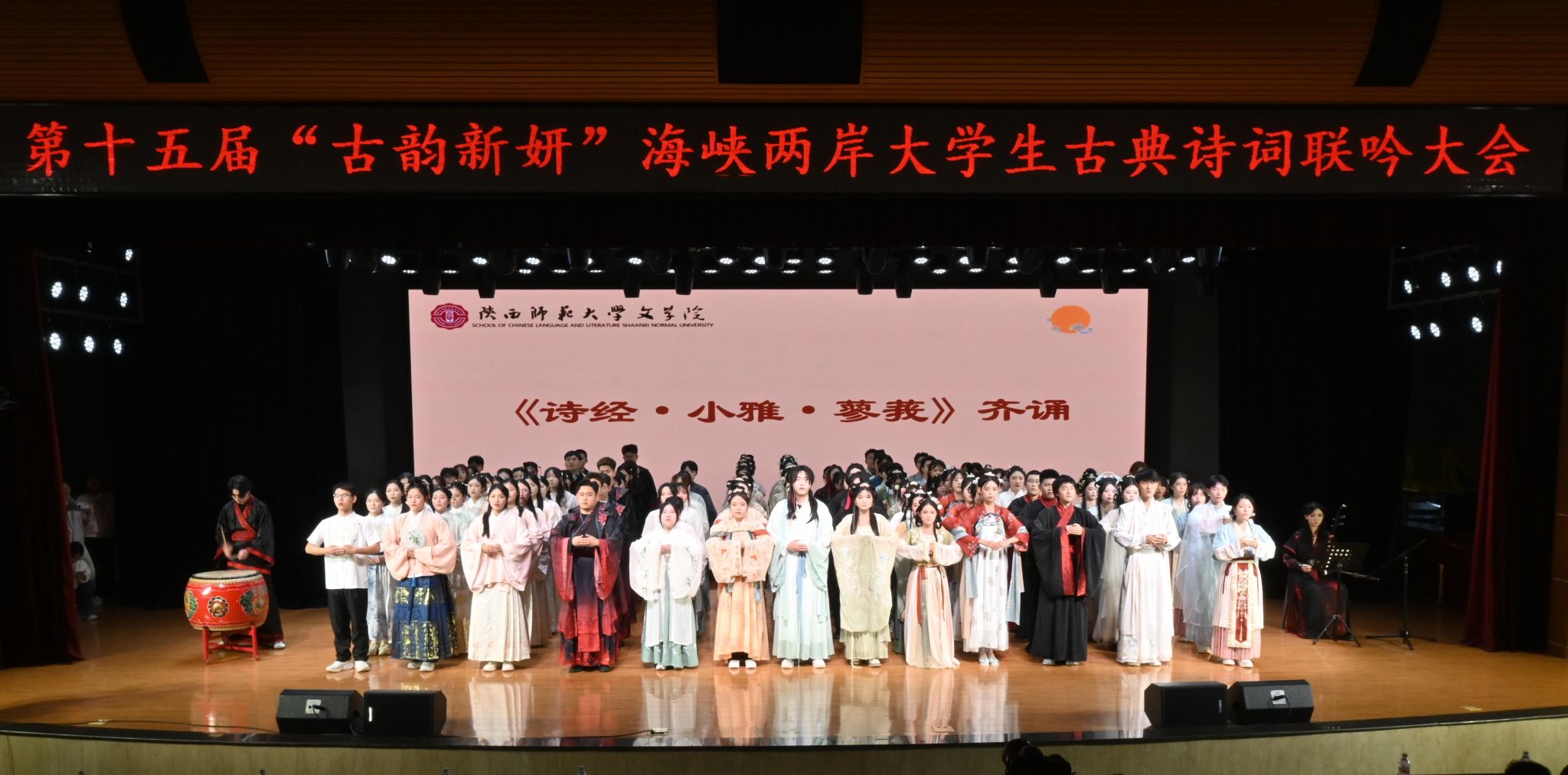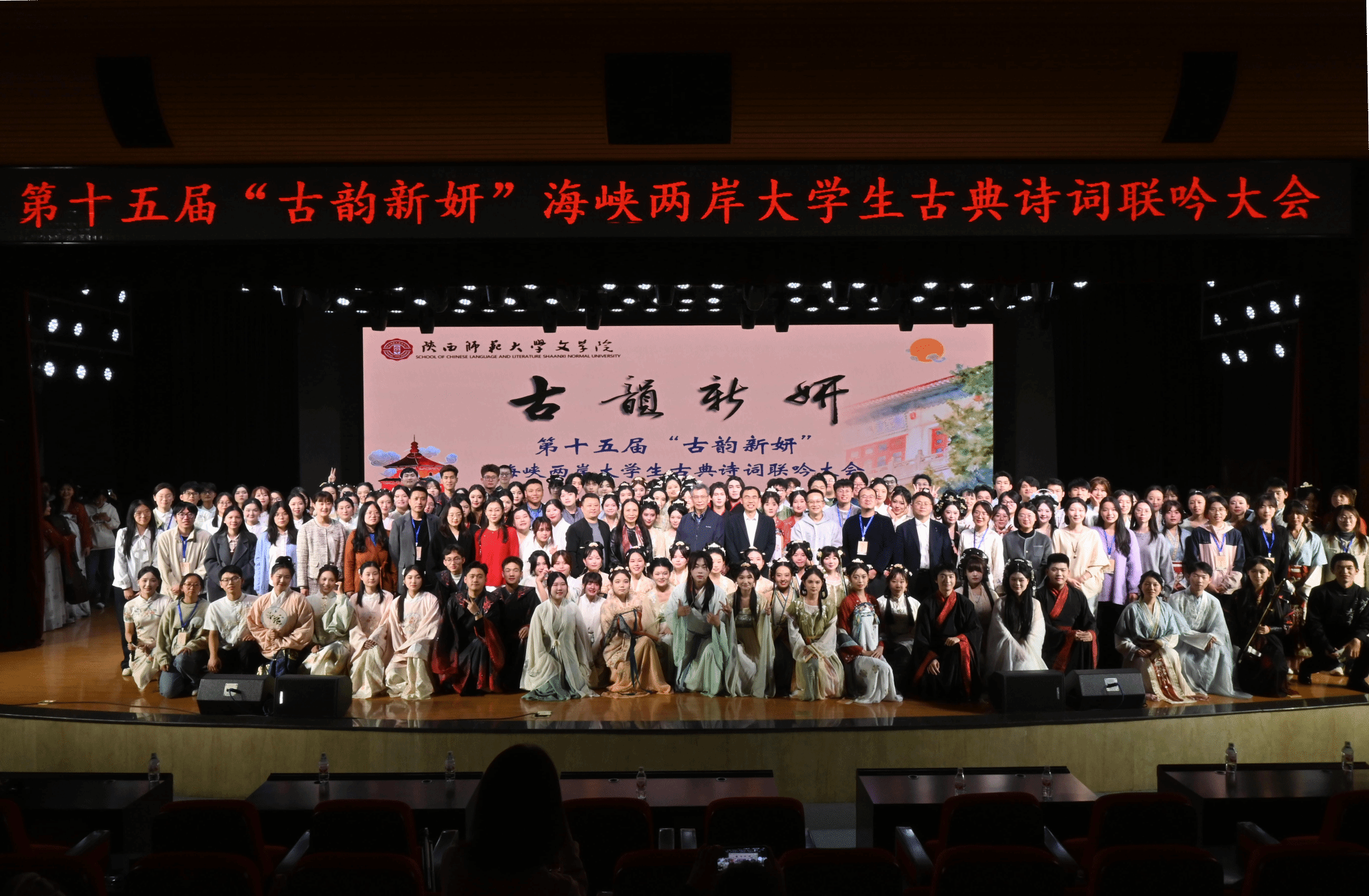 第十五届“古韵新妍”海峡两岸古典诗词联吟展演在陕西师范大学附属小学梧桐诗社的开场诗联诵中拉开序幕。北京师范大学南山诗社、中国台湾辅仁大学东篱诗社、甘肃民族师范学院绿原诗社、江苏师范大学悠然诗社、中南大学中华经典吟唱团、西北师范大学子衿诗社、淮阴师范学院采菊诗社、西北工业大学启翔诗音阁、邯郸学院学步诗社、西安音乐学院云韶吟唱团、陕西师范大学秦风诗社依次登台,展示了《行路难》《西洲曲》《春江花月夜》等经典诗篇。随着《诗经·小雅·蓼莪》的熟悉旋律响起,两岸师生共同吟唱这首保留曲目,也为本次活动画上了圆满的句号。