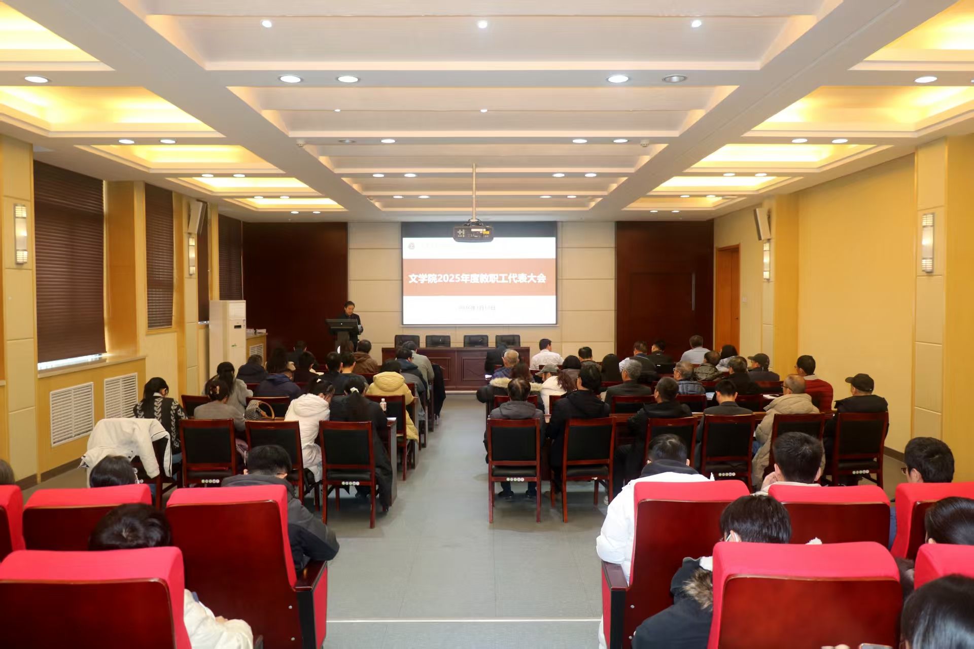 2026年1月15日,我院在文汇楼A段111报告厅召开全体教职工大会,会议由学院党委书记闫文杰、学院工会主席王怀中主持。