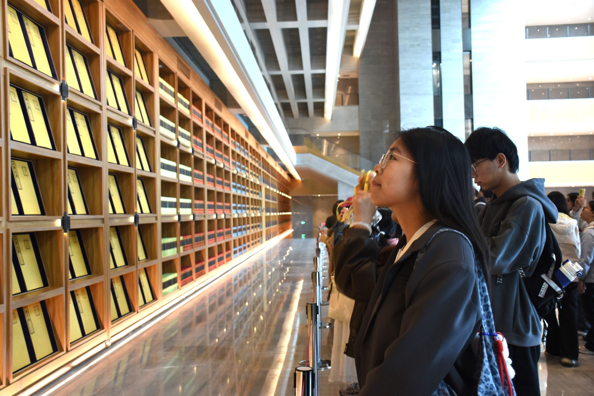 西安国家版本馆作为中国国家版本馆“一总三分”的重要分馆,是集版本保藏、展示、研究于一体的文化殿堂,馆藏丰富、文脉厚重。在专业讲解员引导下,同学们有序参观文济厅、核心展区等重点区域,沉浸式感受中华典籍的千年传承与丝路文明的交融互鉴。文济厅内,巨型书墙气势恢宏,从甲骨、简帛到典籍、影像,《四库全书》《永乐大典》等珍贵版本尽收眼底。同学们驻足凝望,在墨香书卷中见证中华文明绵延不绝的精神根脉。