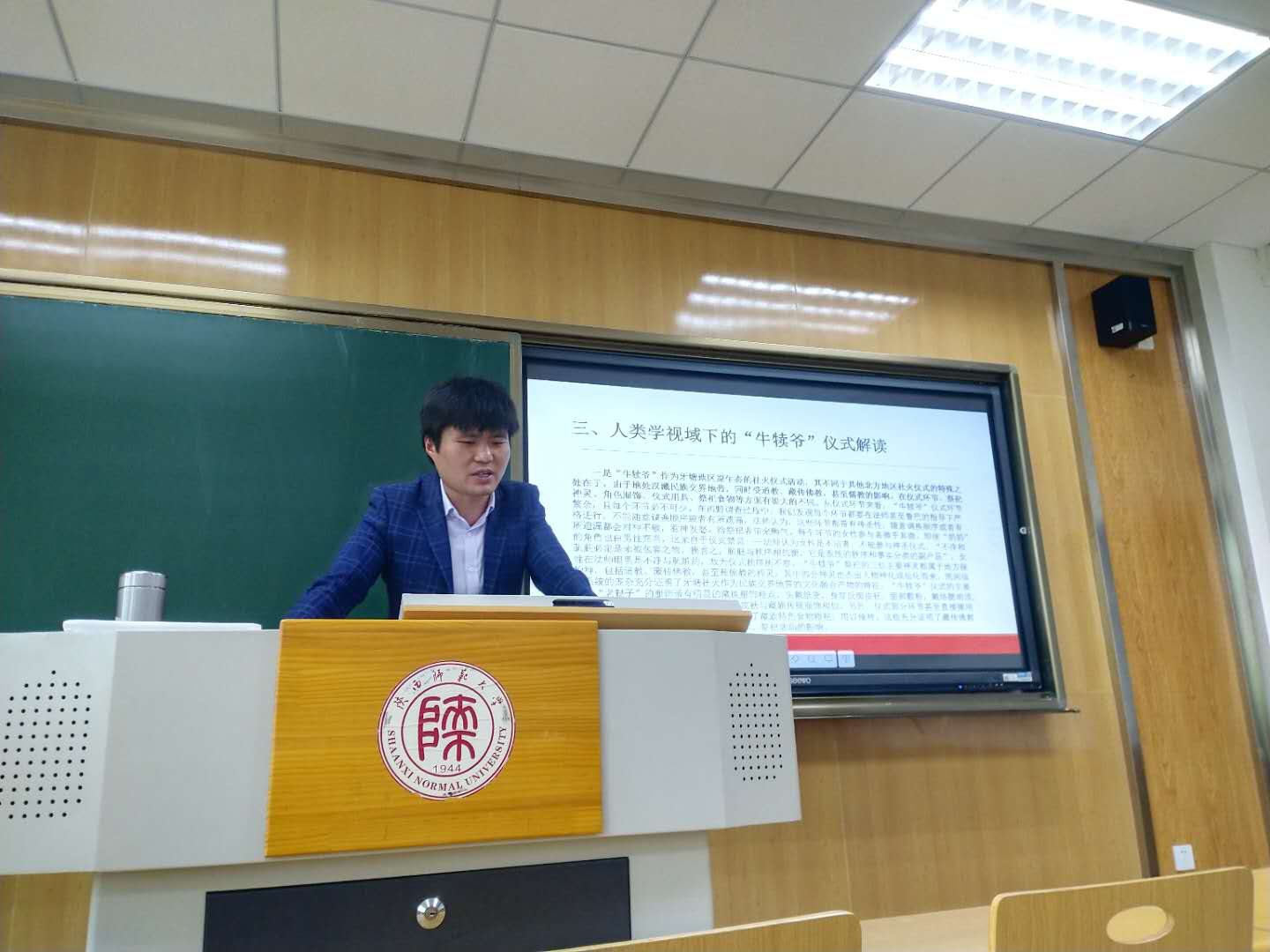 2019年4月12日,第79场博士学术报告以《仪式与记忆:和政牙塘社火“牛犊爷”的人类学解读》为题,由比较文学与世界文学专业博士研究生赵世昌主讲。赵世昌先介绍了牙塘社火“牛犊爷”在地田野调查情况,梳理、复现了仪式的全部环节。他将“牛犊爷”放在人类学视域下进行解读,认为“牛犊爷”作为一种特殊的原生态民俗仪式活动,具有集体文化记忆与仪式叙事来源,携带着祭祀祈禳与祈福送福的主要原生性功能及教育、娱乐、传播生产知识和联结社区的衍生性功能,并成为牙塘民众对共同信奉神灵的集体记忆代代流传,形成了一种约定俗成的伦理道德。